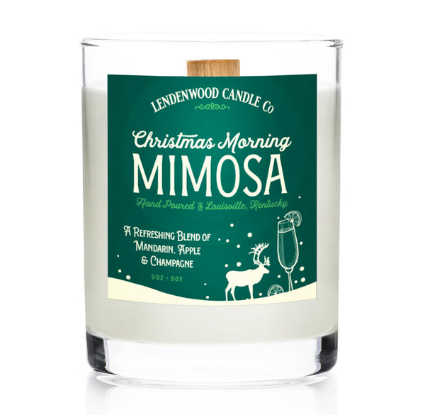 The Classic Christmas Morning Mimosa candle is a fresh brunchy blend of sweet citrus and bubbly champagne. Served up in a sleek leaded bottom rocks glass and topped off with a crackling wooden wick. Hand poured in Louisville, Kentucky USA.